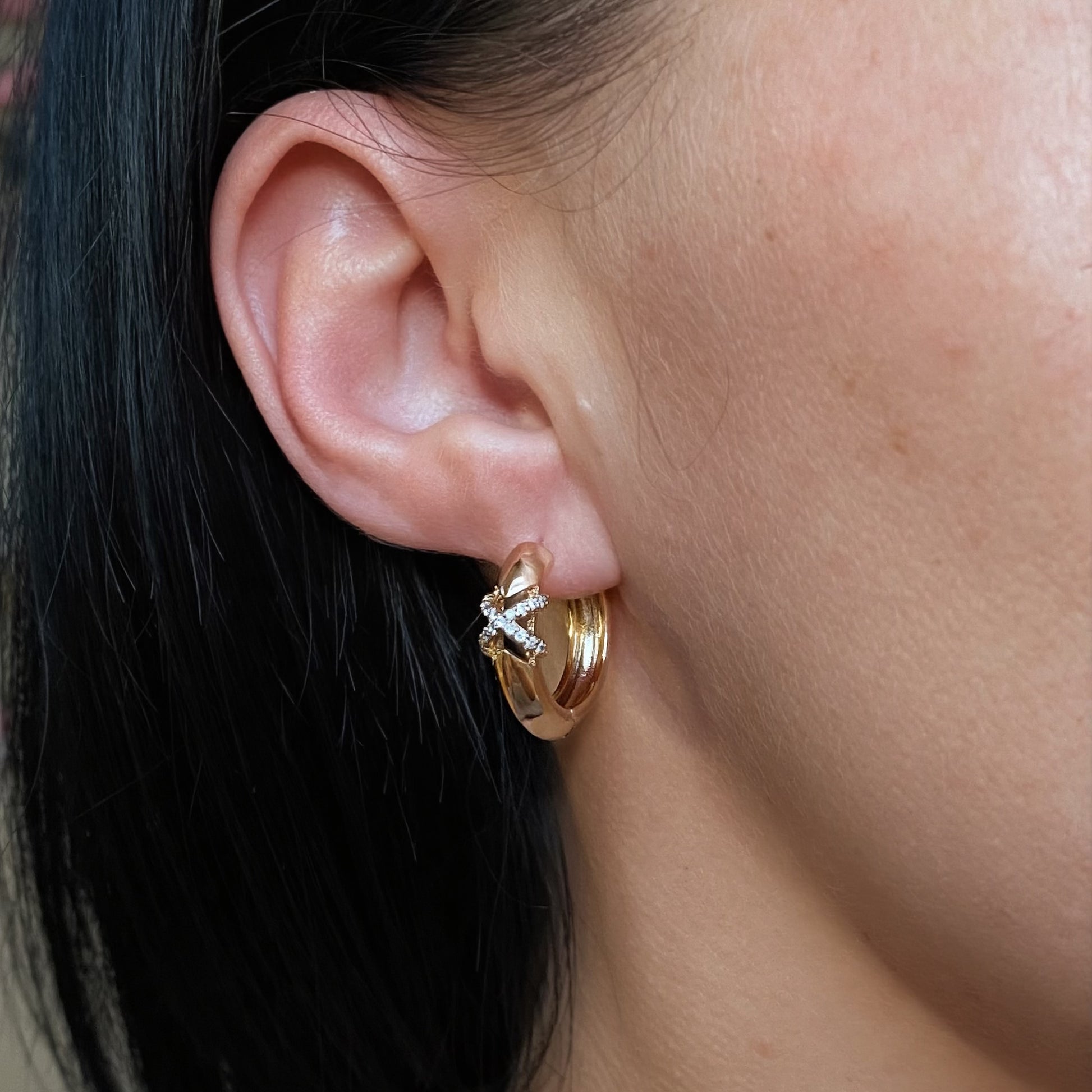 Izteiksmīgi 18K apzeltīti riņķīšu auskari ar elegantu X formas akcentu, kas dekorēts ar smalkiem kubiskā cirkonija akmentiņiem. Šis dizains piešķir klasiskajam riņķīšu siluetam modernu un sievišķīgu raksturu.