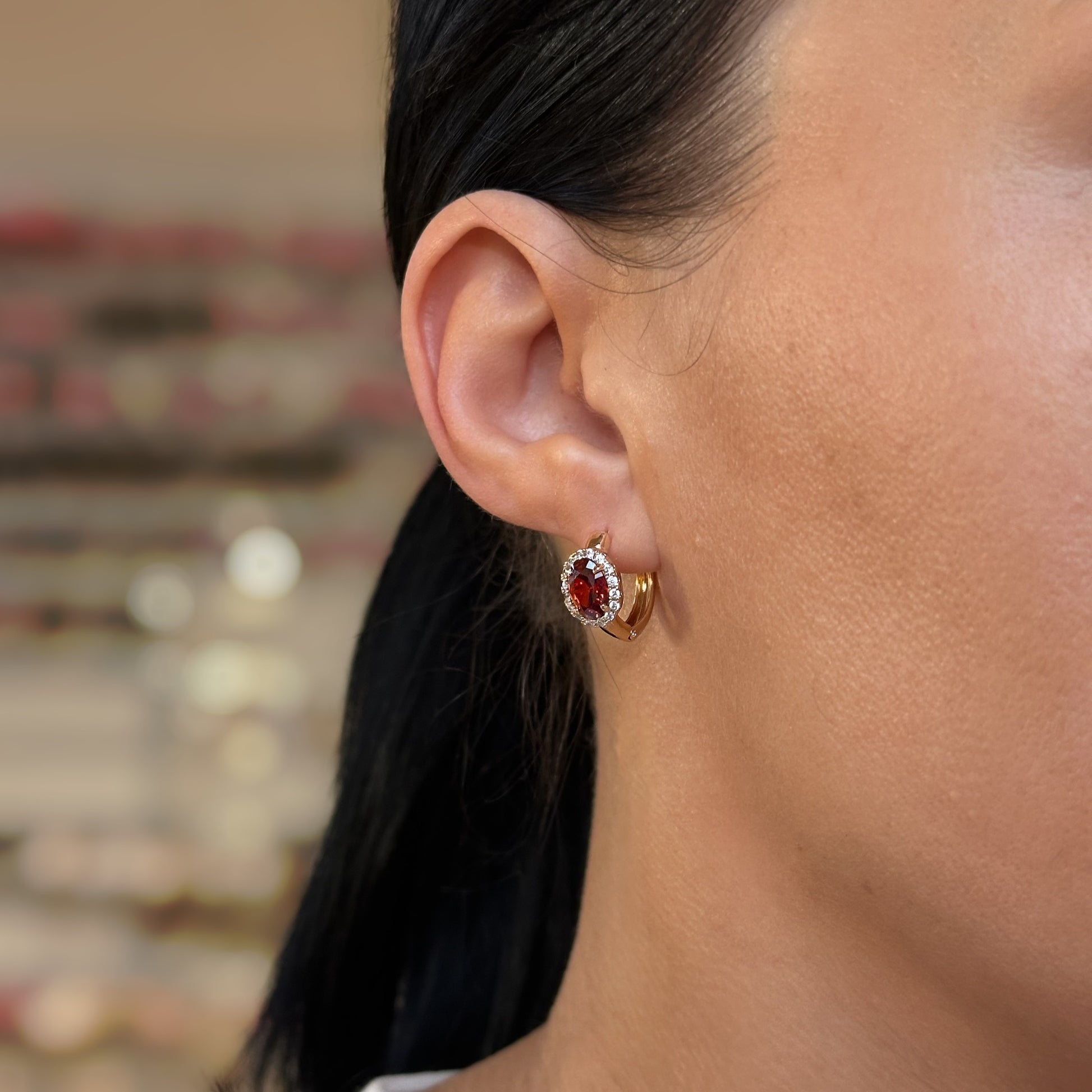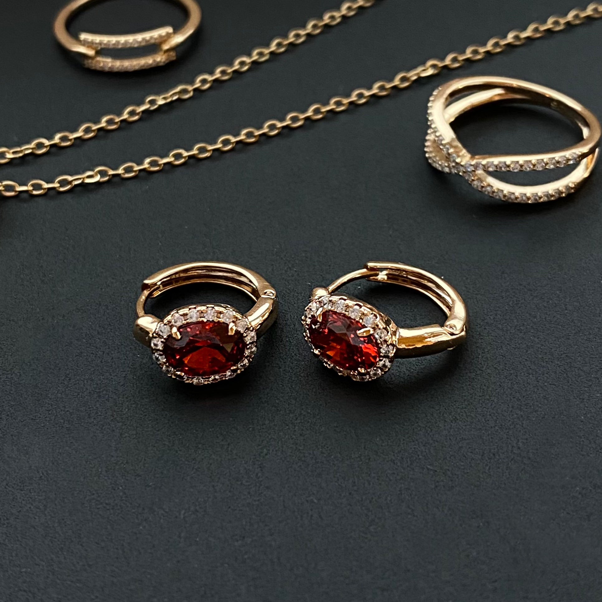 Eleganti 18k apzeltīti riņķīšu auskari ar izteiksmīgu sarkanu kubisko cirkoniju un mirdzošu akcentu. Kompakts izmērs, bet pamanāms efekts – ideāli gan ikdienai, gan svētkiem.