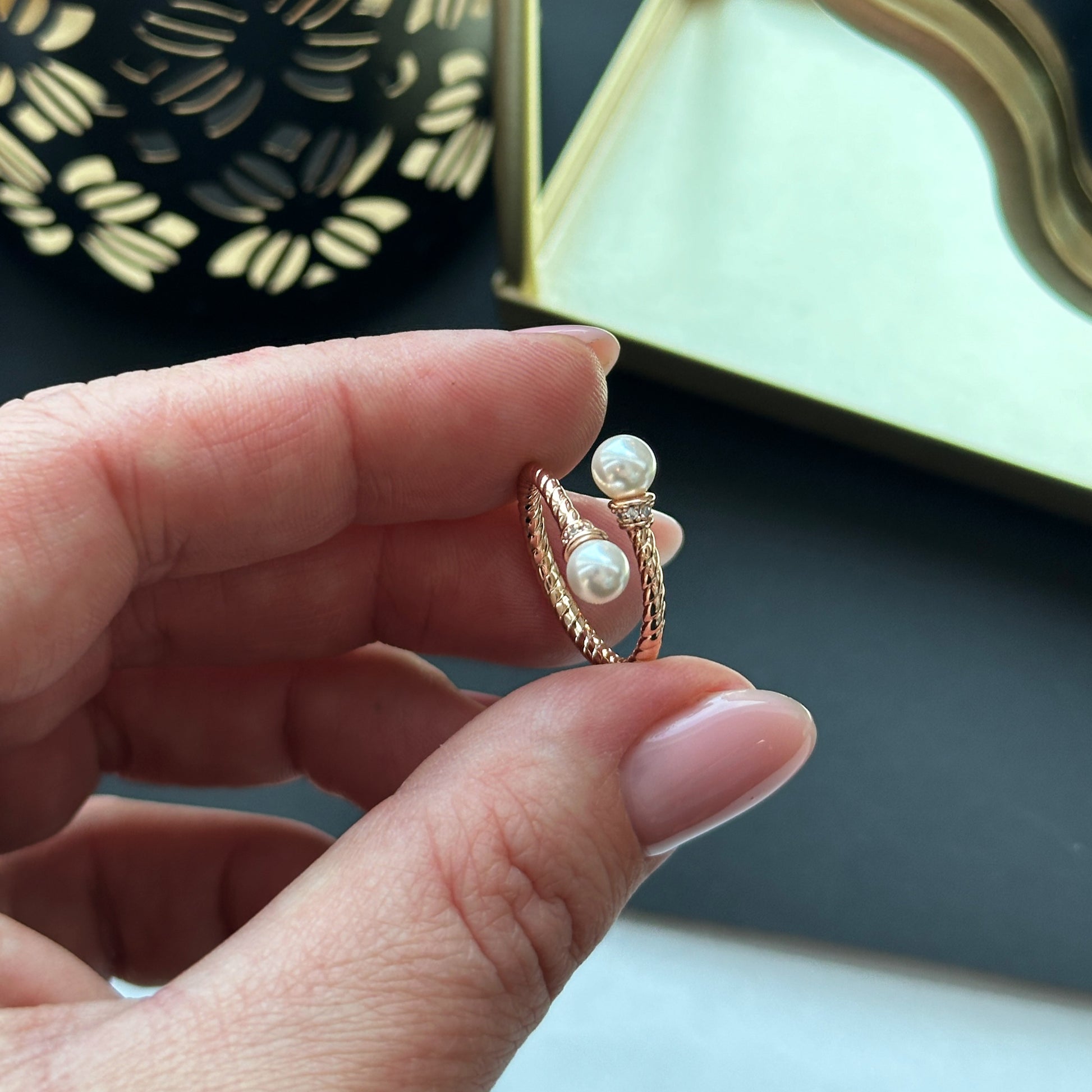 Elegants apzeltīts pērļu gredzens ar divām pērļu detaļām un smalku kubiskā cirkonija akcentu. Tīrs, sievišķīgs dizains, kas izskatās gaumīgi gan ikdienā, gan svētku reizēs.
